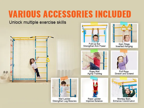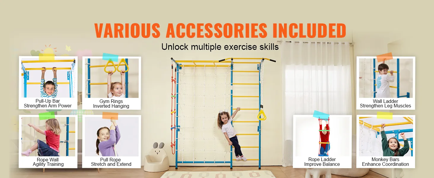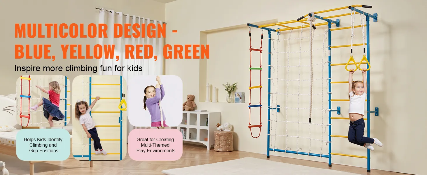 Multifunctional Climbing Playset: Our wall gym for kids combines a pull-up bar, gym rings, rope ladder, and other play activities to help children exercise, improve coordination, and have fun.