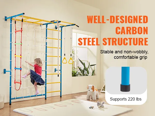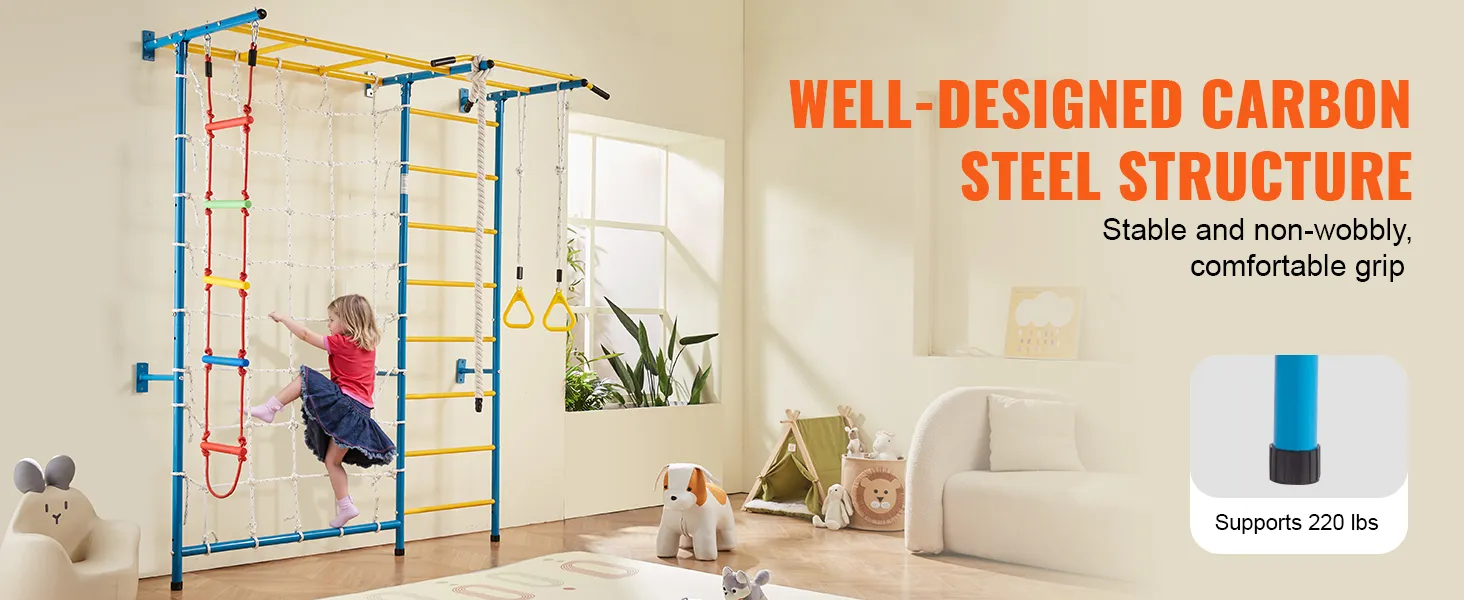 High-Strength Carbon Steel Material: Made from durable carbon steel, this indoor gym for kids is scratch and wear-resistant, ensuring enhanced stability and a long lifespan. The rust-resistant surface is easy to clean with a damp cloth.