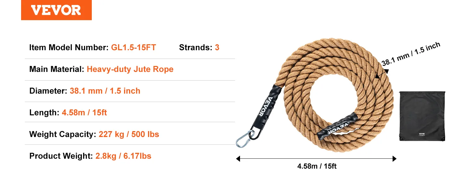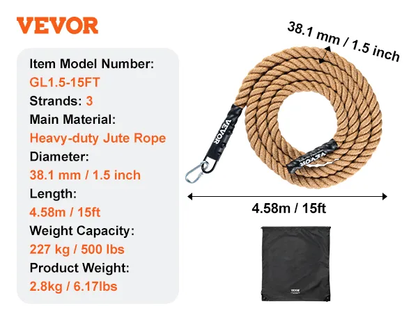 Abrasion Resistance and High Tensile Strength: Constructed from premium heavy-duty hemp rope material with a diameter up to 1.5 inch, this gym climbing rope offers strong tensile strength and abrasion resistance, capable of bearing significant weight and tension. It has undergone a 15,000N tensile strength test and supports a maximum weight of 500 pounds. It's recommended for indoor use in dry environments, avoiding moisture and water contact.