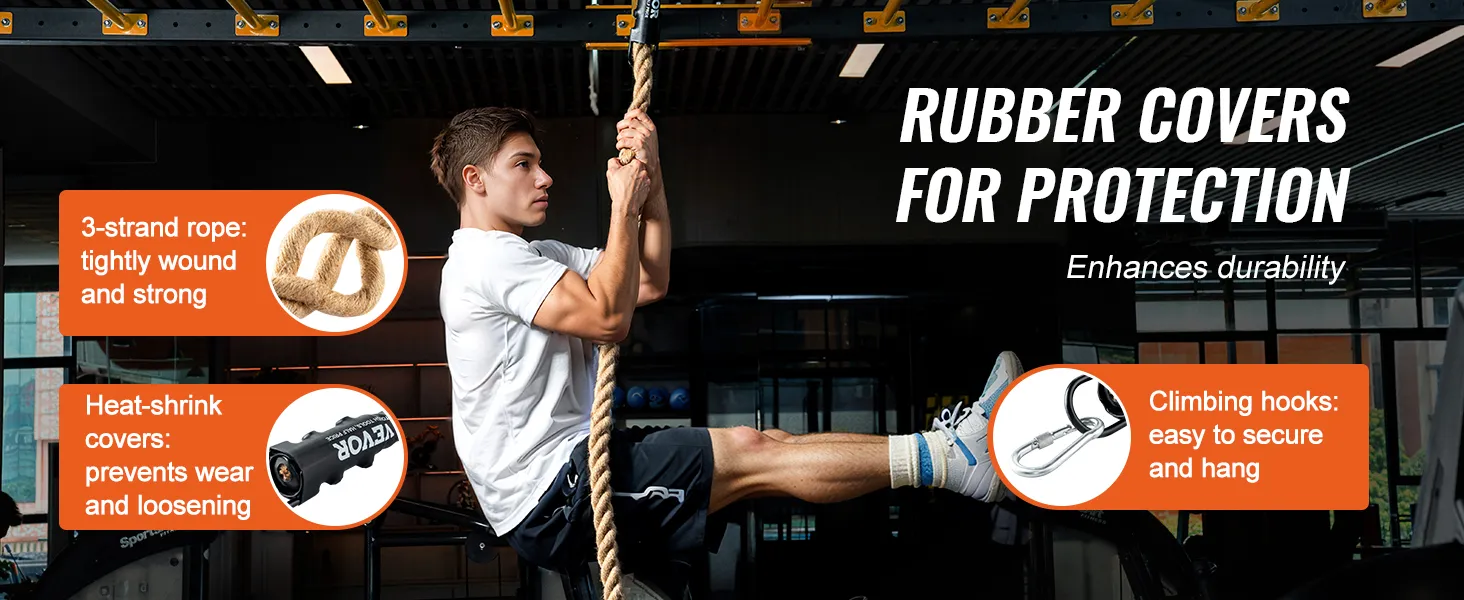 Heat Shrink Rubber Caps: Composed of 3 tightly wound strands of fiber, each end is fitted with heat shrink caps to protect the rope ends, preventing wear and loosening. Additionally, equipped with metal climbing hooks for easy attachment to any fixed point, allowing for indoor climbing exercises and strength training. Enhances strength, promotes fat burning, and provides higher safety during workouts.