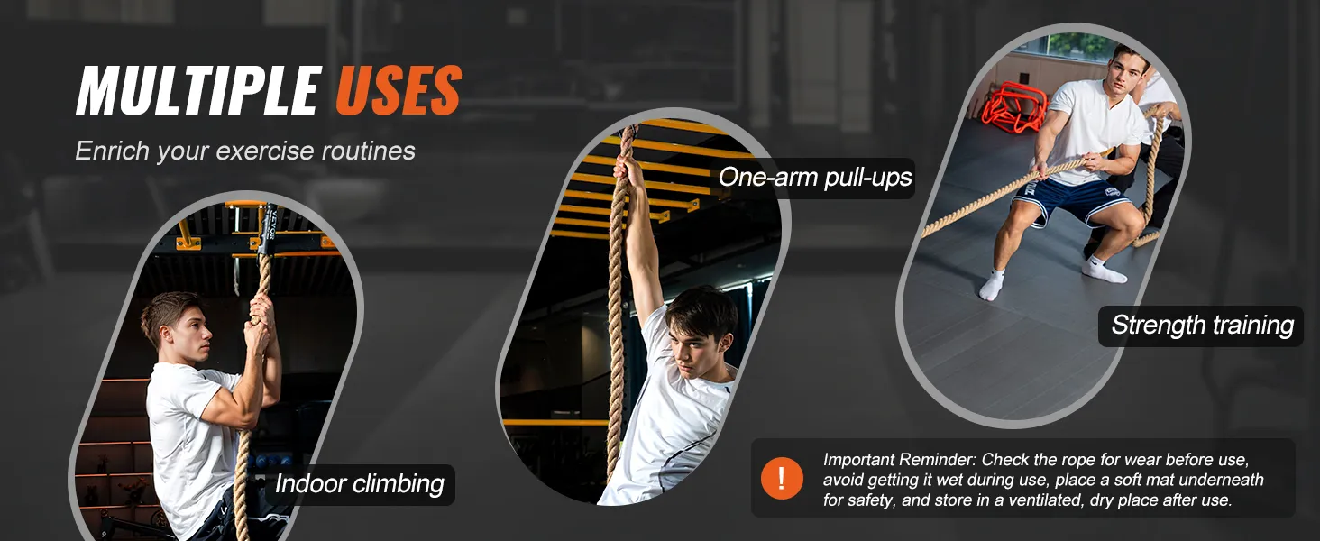 Workout fitness rope is suitable for indoor climbing, strength training, pull-ups, arm stretching, and other exercises. Note: Before use, check the rope for wear; if significantly worn, replace it promptly. Avoid getting the rope wet during use, and place a soft mat underneath to ensure safety.