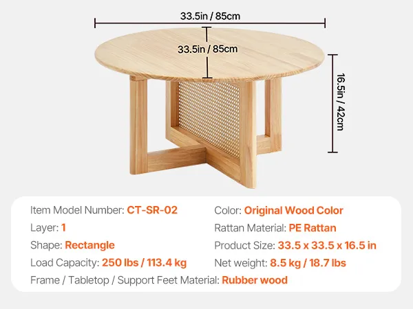 This round rattan coffee table is made from natural rubber wood and durable PE rattan. It supports an impressive weight capacity of 250 lbs (113.4 kg), ensuring robust strength for everyday use.