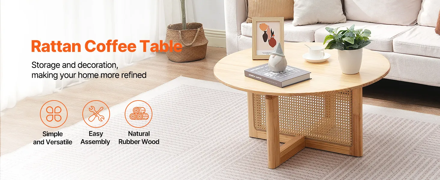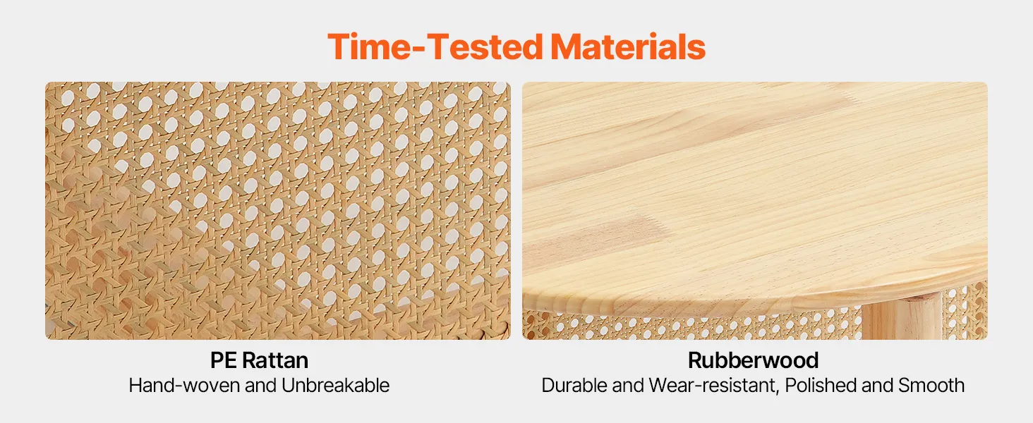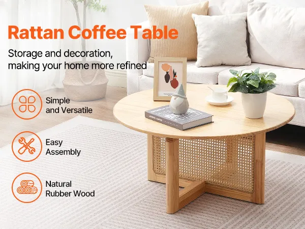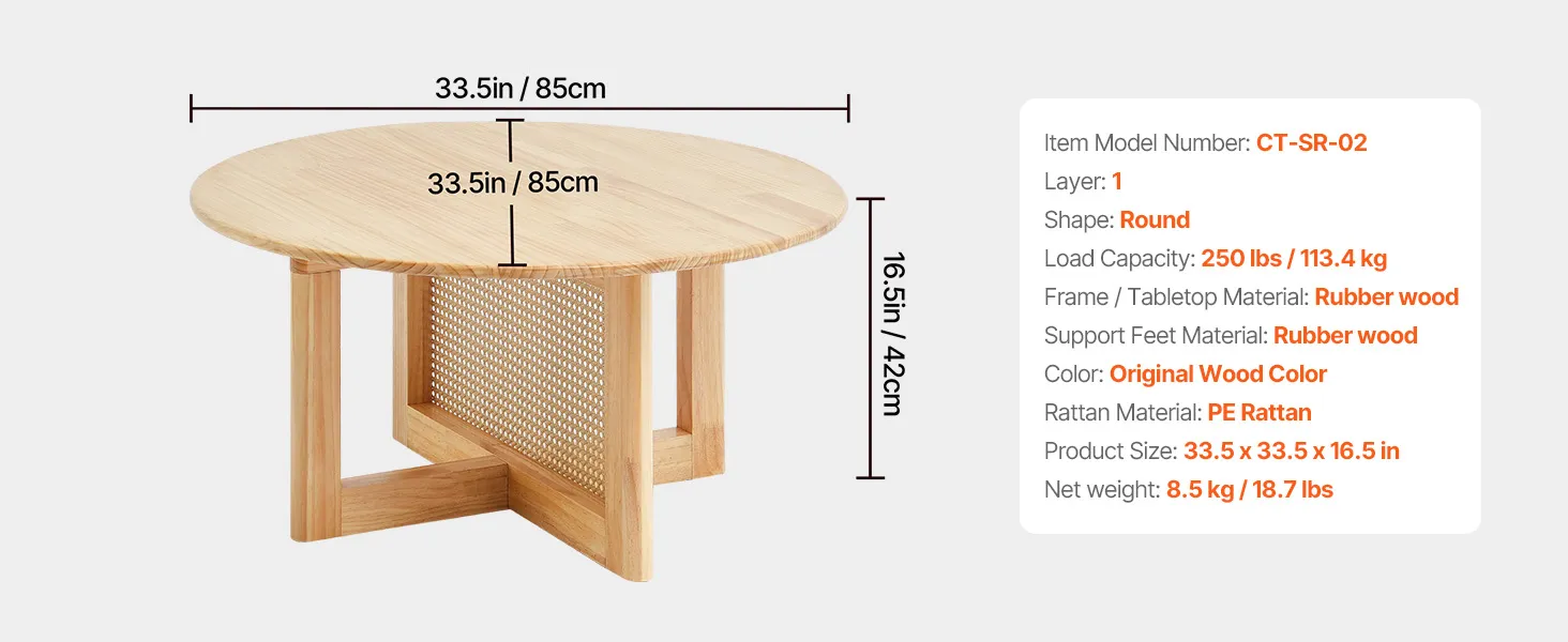 High Quality and Stability: This wood coffee table is constructed with natural rubber wood and PE rattan, providing a solid structure and premium materials. It offers excellent support with a weight capacity of 250 lbs (113.4 kg), holding various items without wobbling or damage.