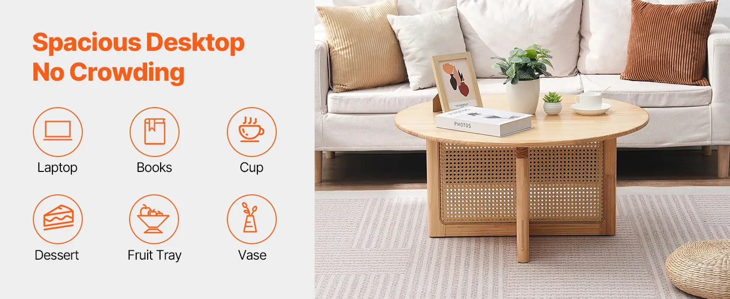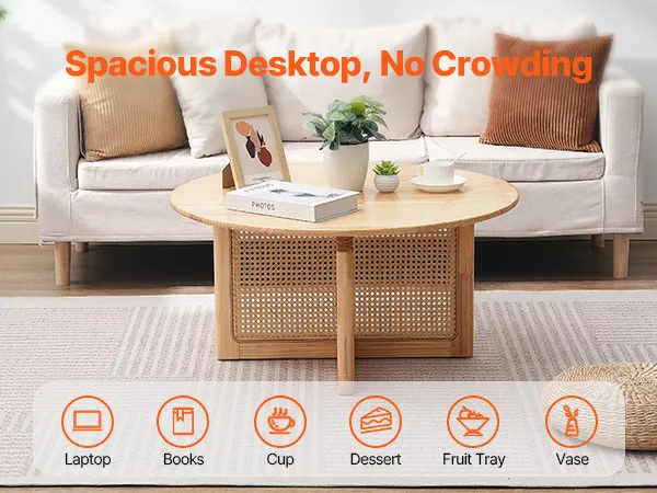 Spacious Surface: Our boho coffee table features a wide, polished solid wood surface that enhances stability and is ideal for placing laptops, cups, remotes, and more. The rattan base design combines decorative appeal with practical storage, making it stylish and functional.