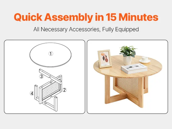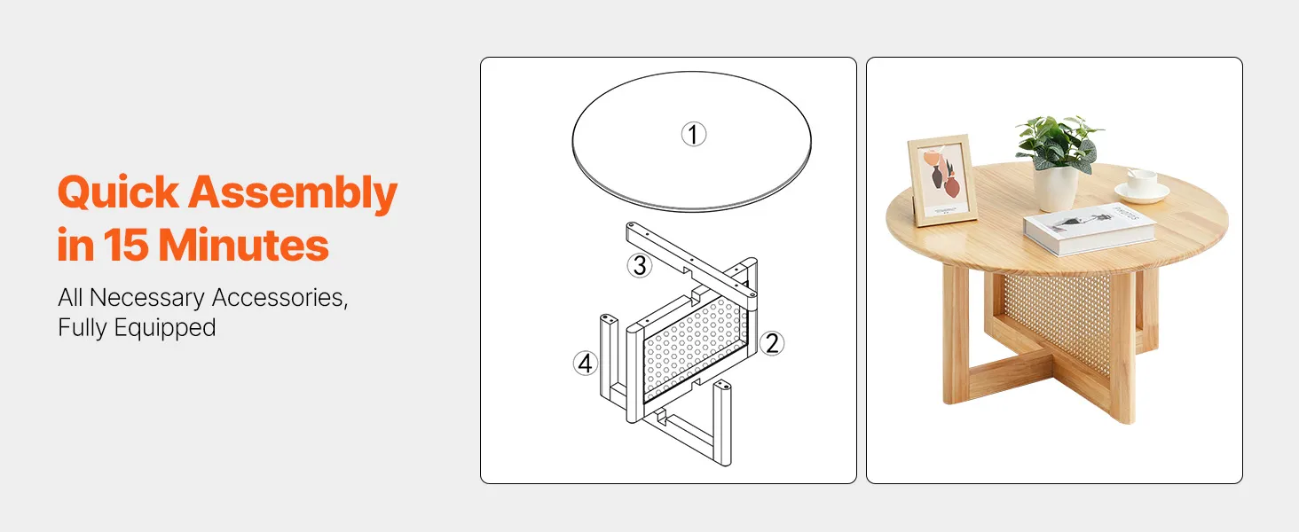This wood coffee table has all the necessary accessories and detailed assembly instructions, allowing you to set it up quickly in 15 minutes.