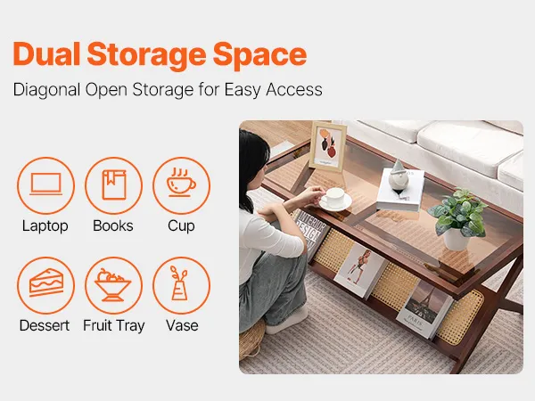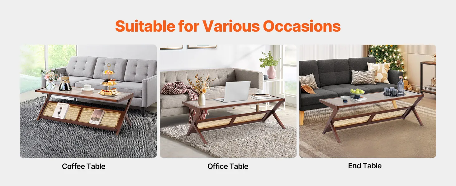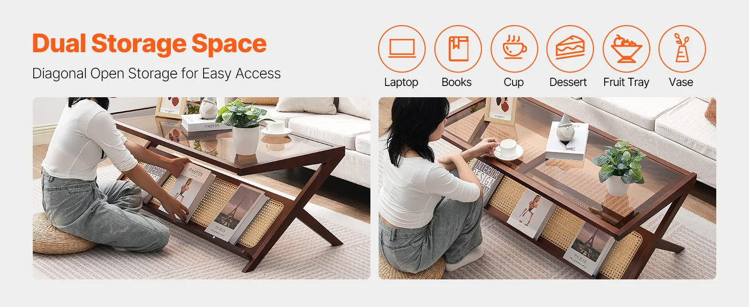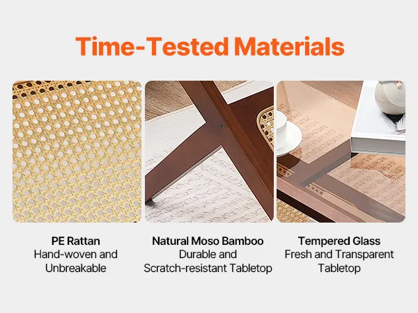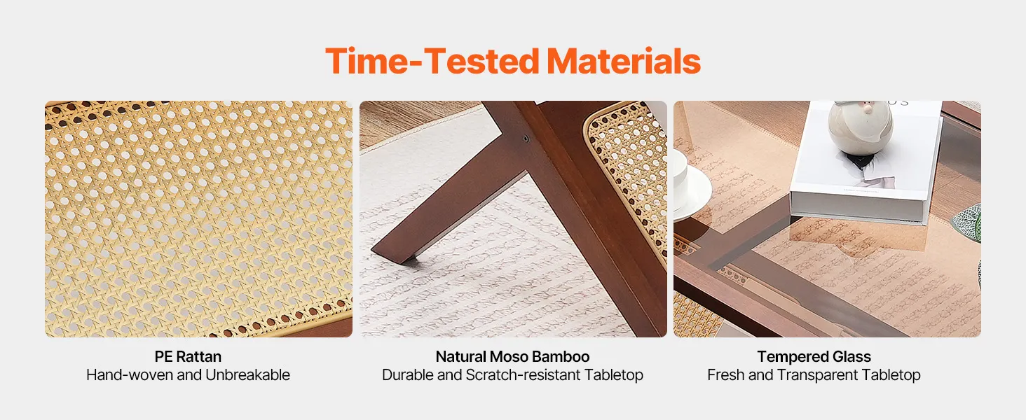Hoge kwaliteit en stabiliteit: deze rotan salontafel heeft een helder tafelblad van gehard glas, natuurlijk bamboe en duurzaam PE-rotan. De stevige constructie ondersteunt maximaal 49,9 kg (110 lbs) en biedt betrouwbare stabiliteit voor al uw benodigdheden zonder te wiebelen of beschadigd te raken.