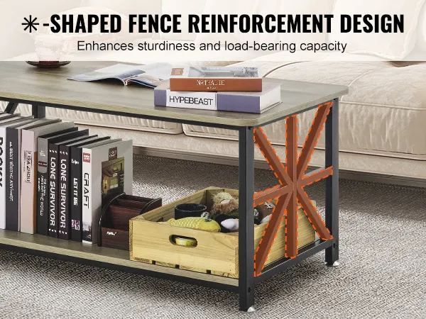 Sturdy and Practical Structure: Made with high-quality wood, the thick tabletop and sturdy legs offer excellent load-bearing capacity, supporting up to 200 lbs without wobbling, even when holding heavy objects. The "*" frame design on both sides enhances stability and adds a farmhouse touch, making it a perfect coffee table option for any room.