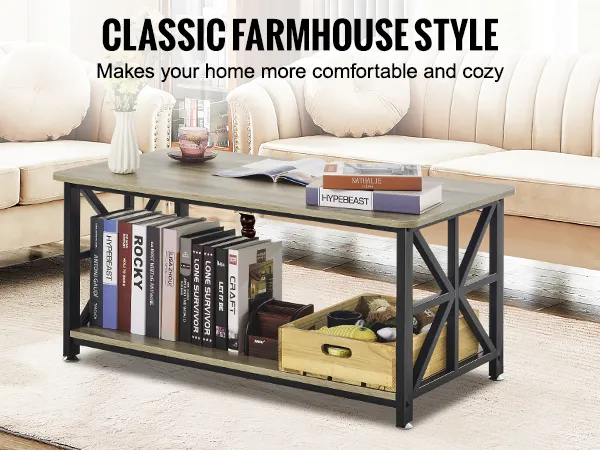 Blending stylish and practical elements, this farmhouse coffee table incorporates vintage aesthetics and wooden materials, creating a natural, cozy, and relaxing atmosphere.