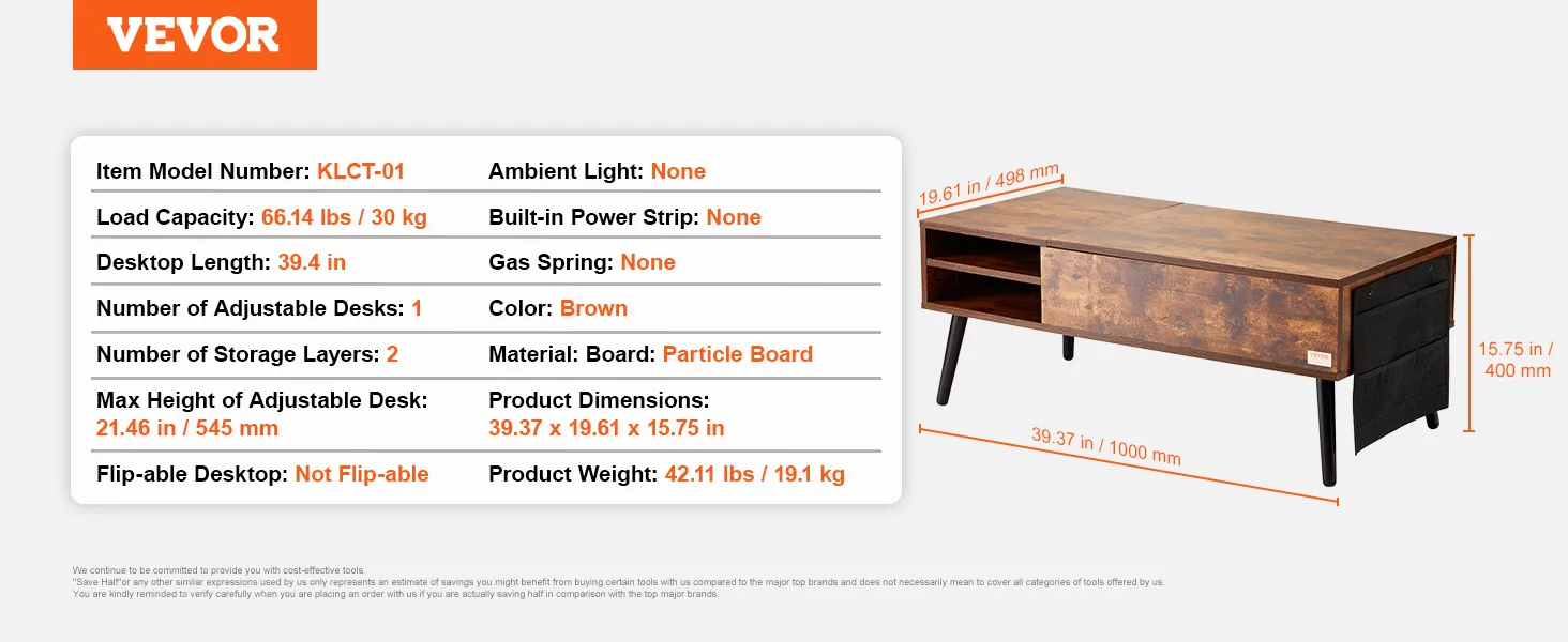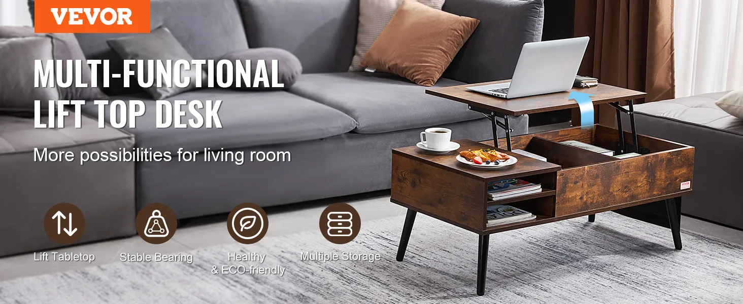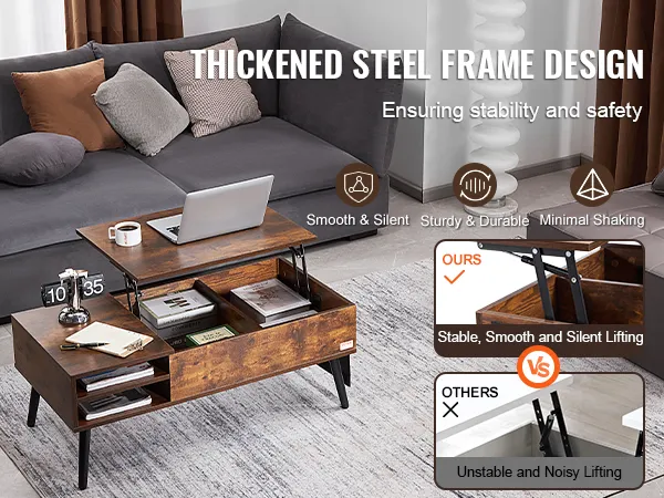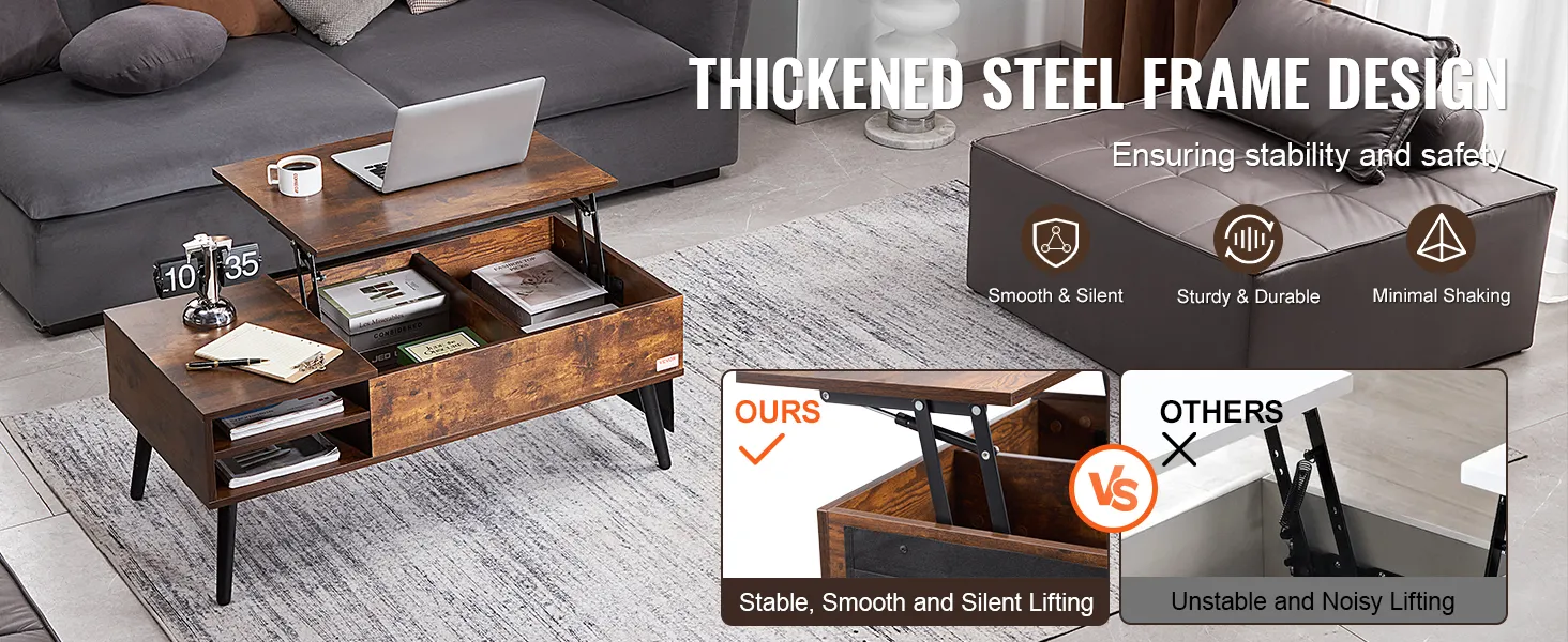 Pneumatic Lifting Mechanism: The lift top coffee table built with a high-quality metal structure, the lifting mechanism allows the tabletop to smoothly adjust without noise. The coffee table made with high-quality particleboard remains stable and sturdy after correct assembly, with strong load-bearing capacity.