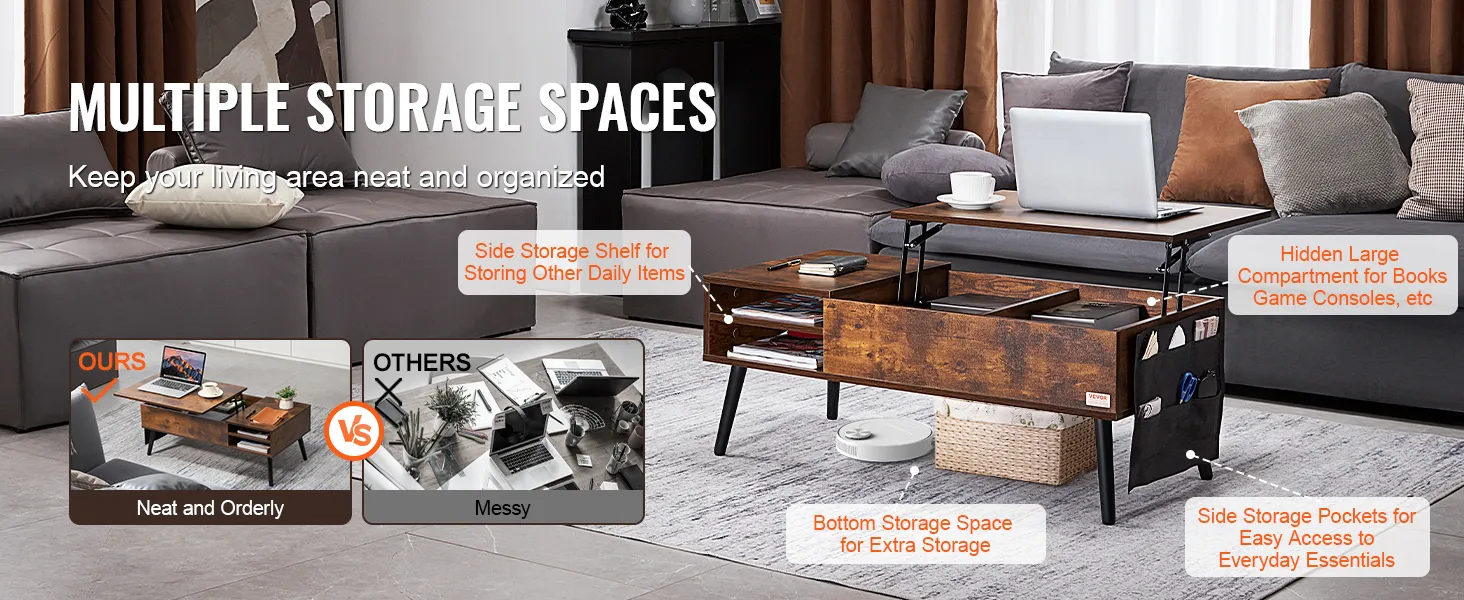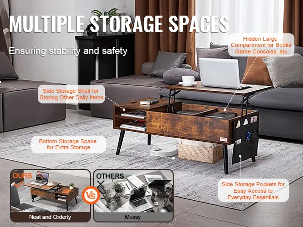 The lift up coffee table includes a hidden storage compartment ideal for books, gaming consoles, and remote controls. Side shelves offer additional storage for daily essentials, while storage bags provide extra space for convenient access. Bottom storage space ensures organized living areas.