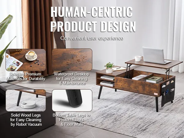 This adjustable coffee table is crafted from high-quality materials, ensuring durability and resistance to wear. Its waterproof tabletop design facilitates easy cleaning and maintenance. The solid wood high-leg design allows robot vacuums to move freely, making cleaning effortless.