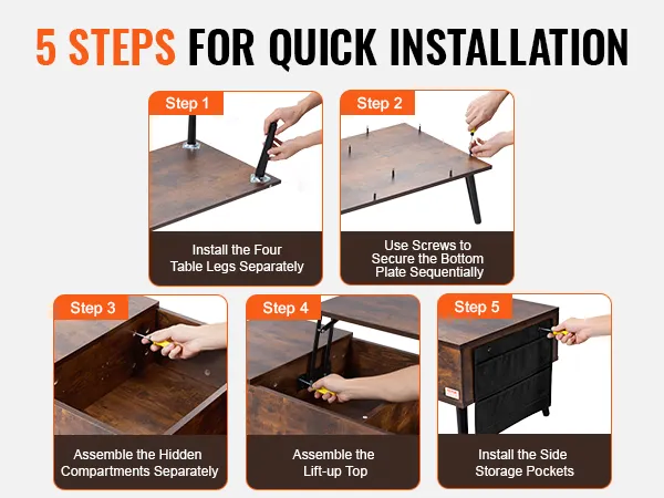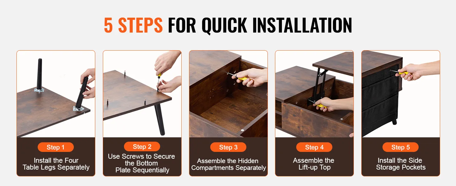 Easy Installation & Operation: This adjustable lift up coffee table comes with all necessary parts, tools, and assembly instructions with diagrams. Simply follow the instructions for easy and straightforward assembly, suitable for both beginners and experienced users.