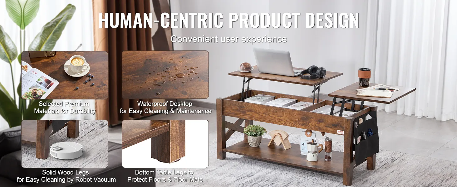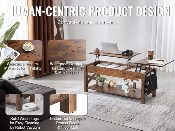 This adjustable coffee table is crafted from high-quality materials, ensuring durability and resistance to wear. Its waterproof tabletop design facilitates easy cleaning and maintenance. The solid wood high-leg design allows robot vacuums to move freely, making cleaning effortless.