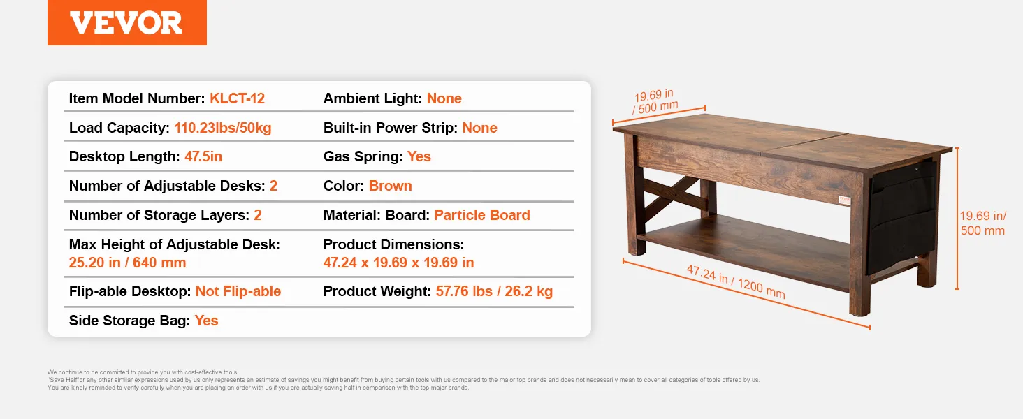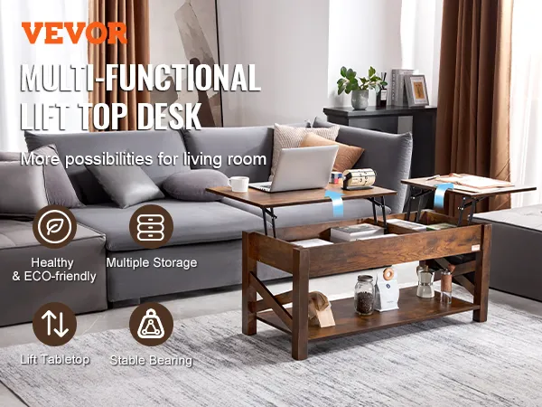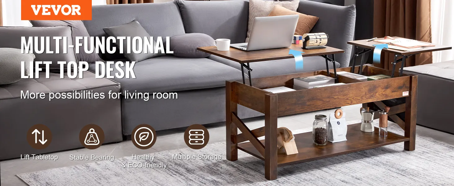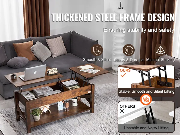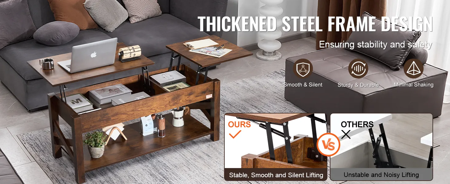 Pneumatic Lifting Mechanism: The lift top coffee table built with a high-quality metal structure, the lifting mechanism allows the tabletop to smoothly adjust without noise. The coffee table made with high-quality particleboard remains stable and sturdy after correct assembly, with strong load-bearing capacity.