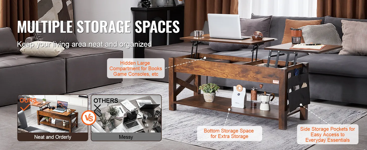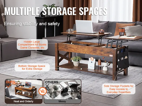 The lift up coffee table includes a hidden storage compartment ideal for books, gaming consoles, and remote controls. Side shelves offer additional storage for daily essentials, while storage bags provide extra space for convenient access. Bottom storage space ensures organized living areas.