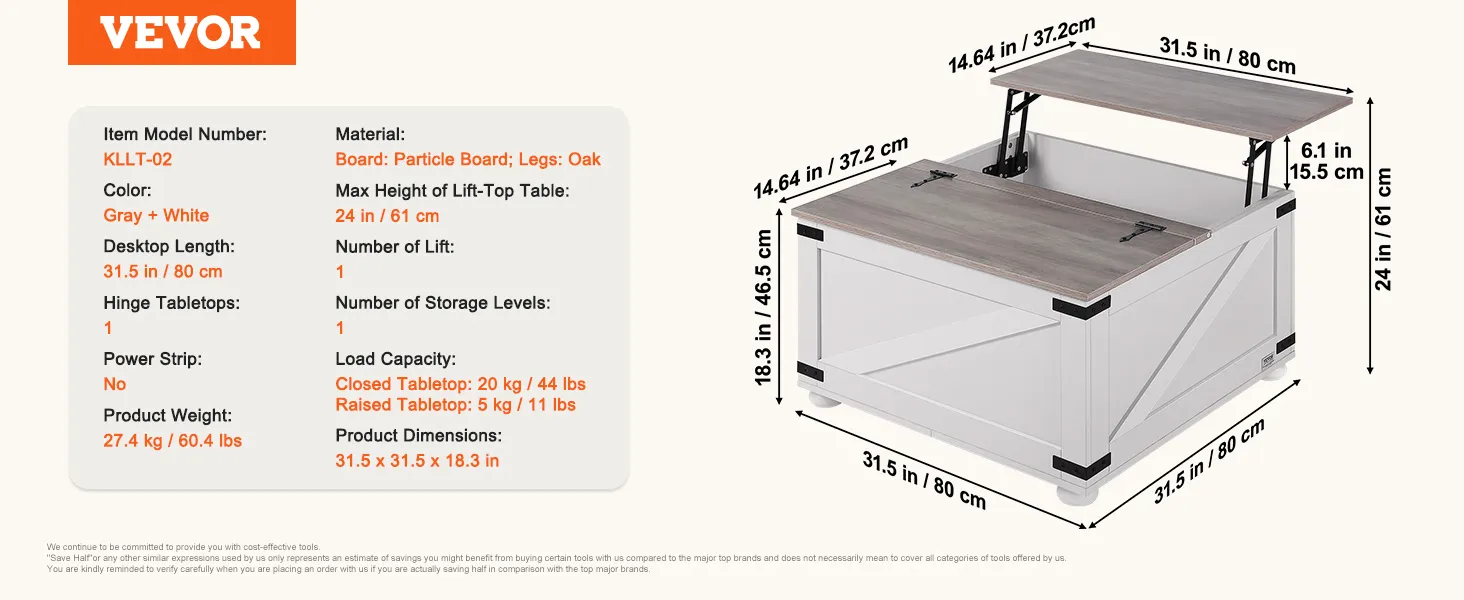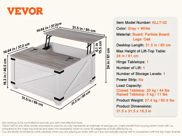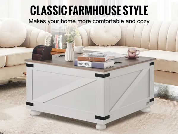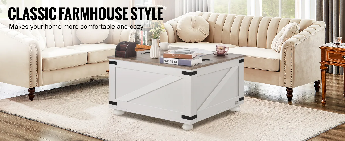 VEVOR 31.5" Farmhouse Coffee Table, Hinged Lift Top Coffee Square Table with Storage Compartment, Wooden Rustic Cocktail Table for Living Room, Bedroom, Apartment, Studio, Gray & White VEVOR 31.5" Farmhouse Coffee Table, Hinged Lift Top Coffee Square Table with Storage Compartment, Wooden Rustic Cocktail Table for Living Room, Bedroom, Apartment, Studio, Gray & White