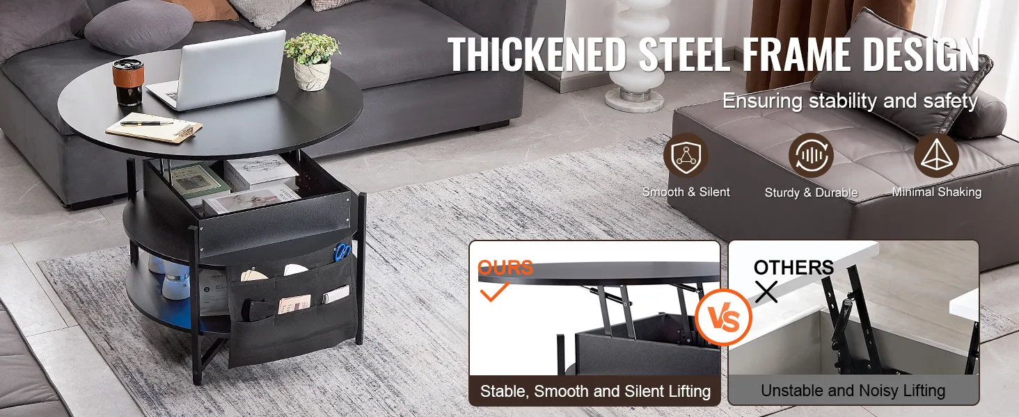 • Pneumatic Lifting Mechanism: The lift top coffee table built with a high-quality metal structure, the lifting mechanism allows the tabletop to smoothly adjust without noise. The coffee table made with high-quality particleboard remains stable and sturdy after correct assembly, with strong load-bearing capacity.