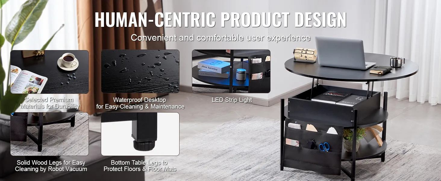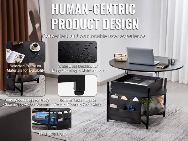 This adjustable coffee table is crafted from high-quality materials, ensuring durability and resistance to wear. Its waterproof tabletop design facilitates easy cleaning and maintenance. The solid wood high-leg design allows robot vacuums to move freely, making cleaning effortless.