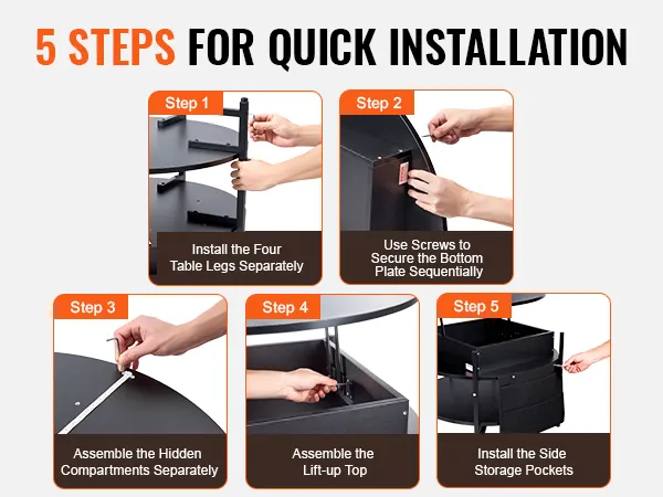 The pop up coffee table with enclosed parts, tools, and assembly instructions, assembly is straightforward. Simply follow the step-by-step instructions for easy installation without the need for professional assistance, suitable for beginners.