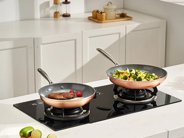 Comfortabele handgreep, blijft koel: onze aluminium koekenpannenset heeft een ergonomische, gegoten stalen handgreep die aan de pan is geklonken voor langdurige duurzaamheid en comfort. De handgreep blijft koel op het fornuis om aanbranden te voorkomen en voegt een strakke, moderne touch toe.