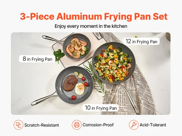 Onze aluminium koekenpannenset bevat pannen in de maten 20, 27 en 30 cm. Deze pannen zijn ontworpen voor snel en gelijkmatig koken en behouden de natuurlijke voedingsstoffen van uw ingrediënten, terwijl ze voldoen aan tal van dagelijkse kookbehoeften.