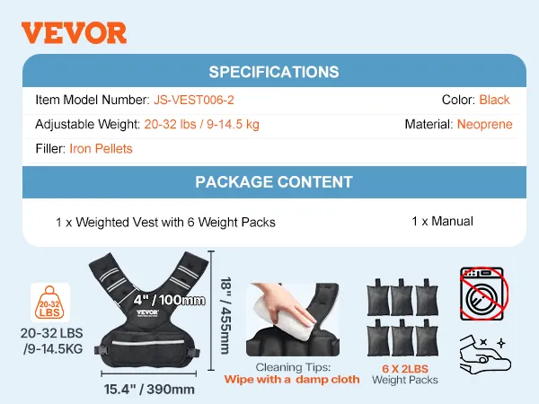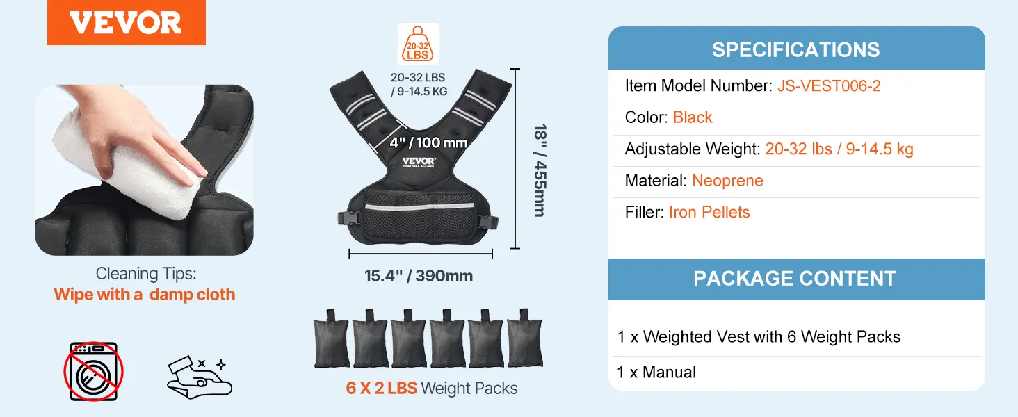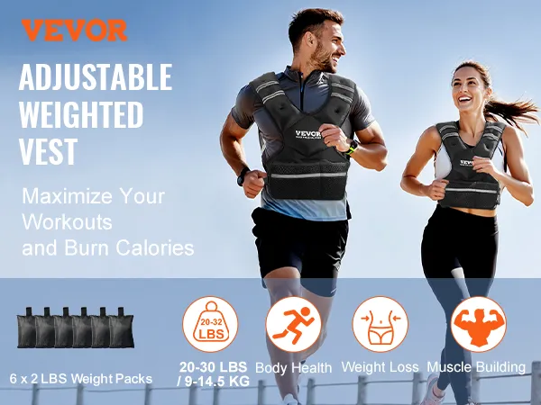 Adjustable Weighted Vest: This weighted vest's weight can be adjusted from 20 lbs to 32 lbs. This vest weighs 20 pounds and includes six 2-pound iron pellet weight bags. Customize your workout intensity and tailor your training routine to meet your fitness goals.