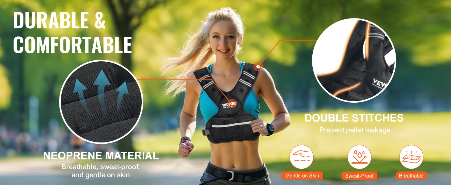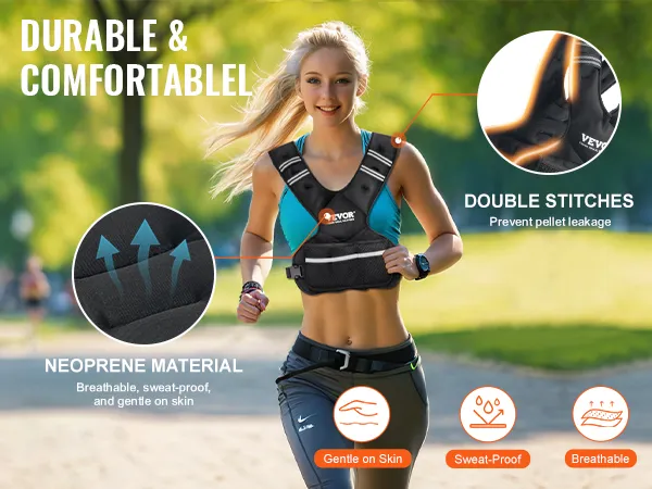 Made with premium neoprene, this adjustable weight vest is breathable, sweat-resistant, and gentle on your skin. Its double-stitched construction prevents iron pellet leakage, ensuring stability and no unpleasant odors during your exercises.