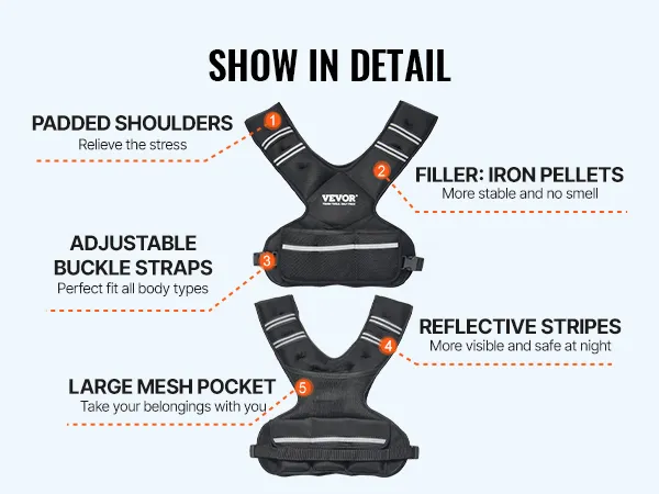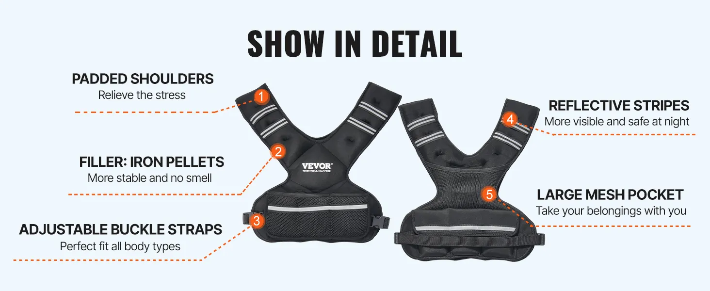 Thoughtful Details: Stay visible and safe during nighttime activities with multiple reflective stripes. The adjustable weight vest also features a large mesh pocket, perfect for carrying your belongings while you work out.