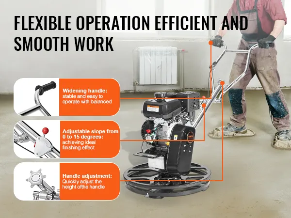 Een van de beste functies is de instelbare bladhoek. U kunt de hoek aanpassen van 0-28° naar uw gewenste afwerking. Met deze functie kunt u verschillende oppervlakteafwerkingen bereiken. U kunt bijvoorbeeld subtiele matte, zachte glans of schitterende betonoppervlakken creëren. De veelzijdigheid maakt het geschikt voor verschillende bouwbehoeften. Het is voordelig voor professionals die aan uiteenlopende projecten werken. Een instelbare hoek garandeert de precieze afwerking die u nodig hebt. Dat betekent dat u het proces vereenvoudigt en tijd bespaart. De troffel is een waardevol hulpmiddel in elke bouwomgeving.