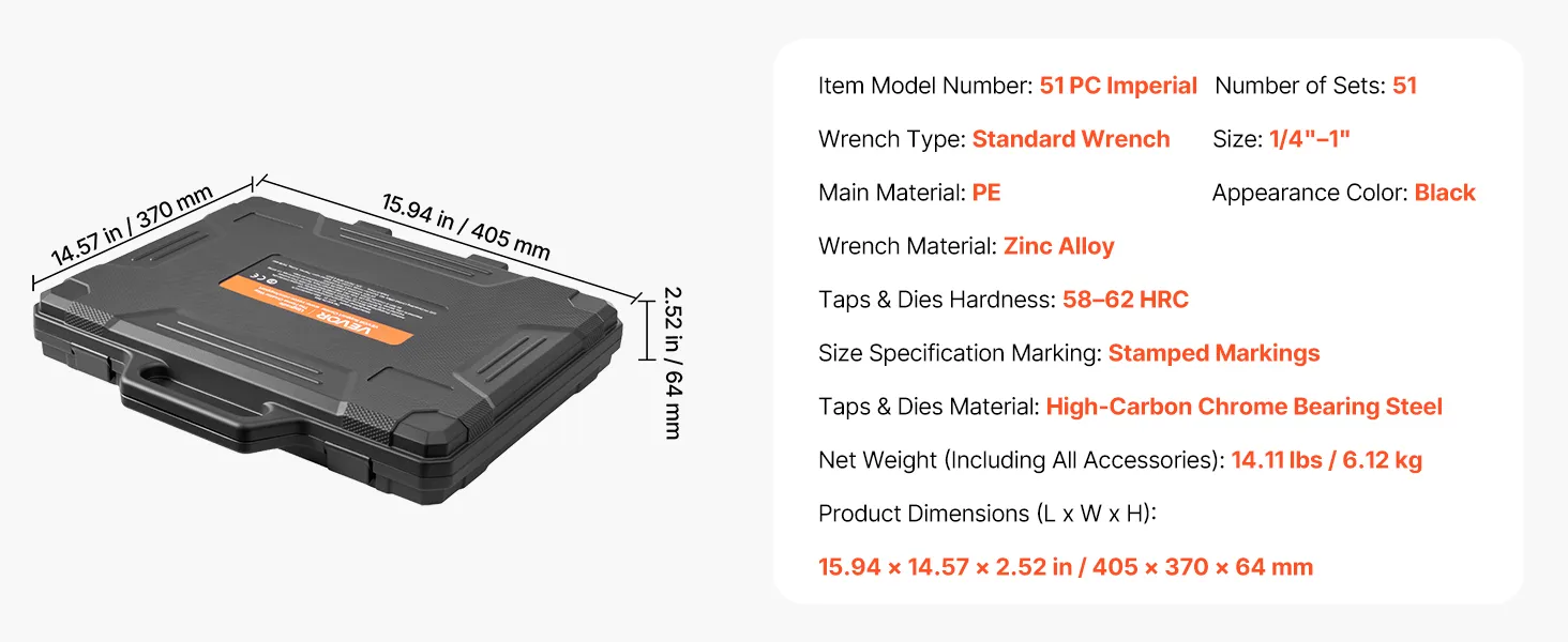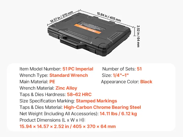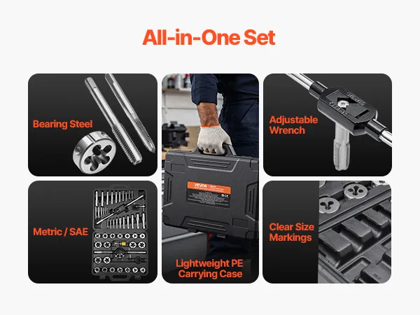 • 51-delige SAE-set: Deze complete 51-delige draadsnijset dekt alle gangbare taken op het gebied van inwendig en uitwendig schroefdraad. Hij is ideaal voor zowel het snijden van nieuw schroefdraad als het professioneel repareren van beschadigd schroefdraad. Omdat alle benodigde gereedschappen zijn inbegrepen, heeft u geen extra gereedschapssets nodig voor uw projecten.