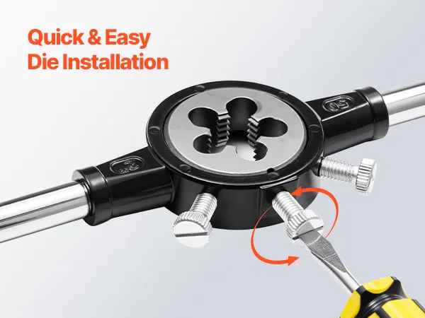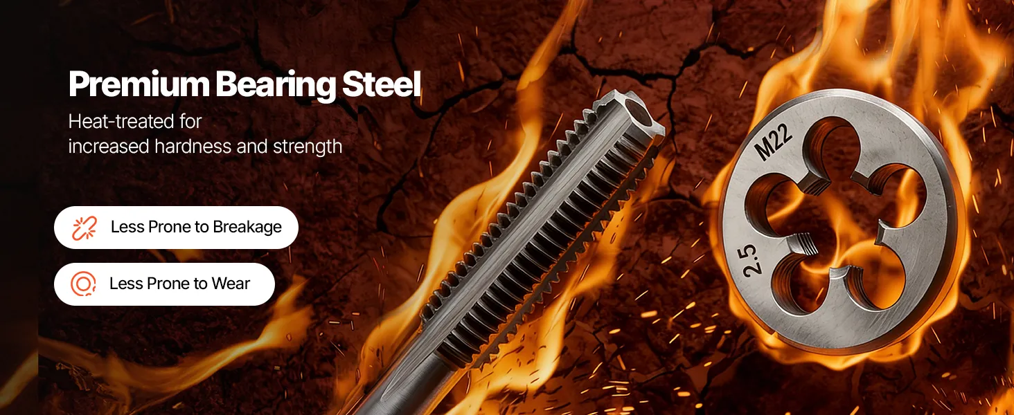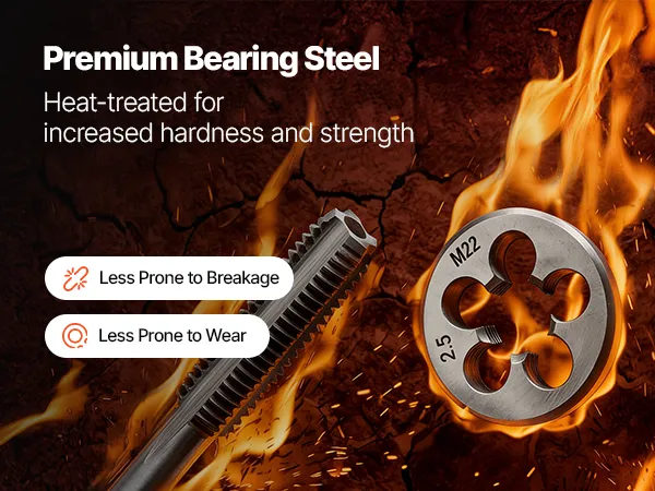 • Gemaakt van lagerstaal: Deze draadsnij- en snijmatrijsset is vervaardigd uit hoogwaardig lagerstaal en warmtebehandeld bij 800 °C (1472 ℉). Dit zorgt voor een superieure hardheid en slijtvastheid, waardoor hij geschikt is voor langdurig en frequent draadsnijden.