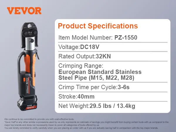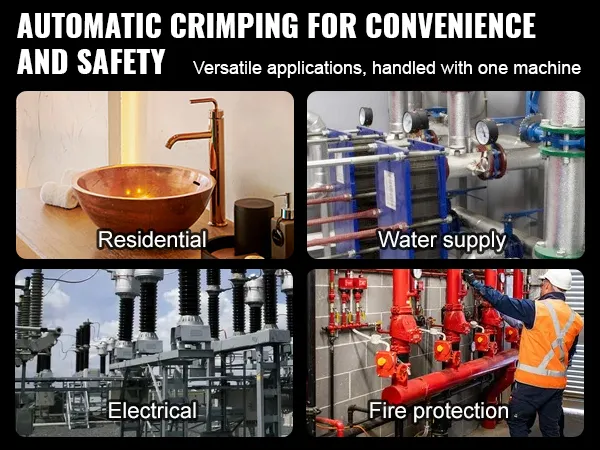 Wide Application Range: Automatic crimping with electric control, saving time and effort. The press tool automatically returns to the starting position after crimping, suitable for crimping stainless steel pipes. Ideal for residential and other industrial applications.