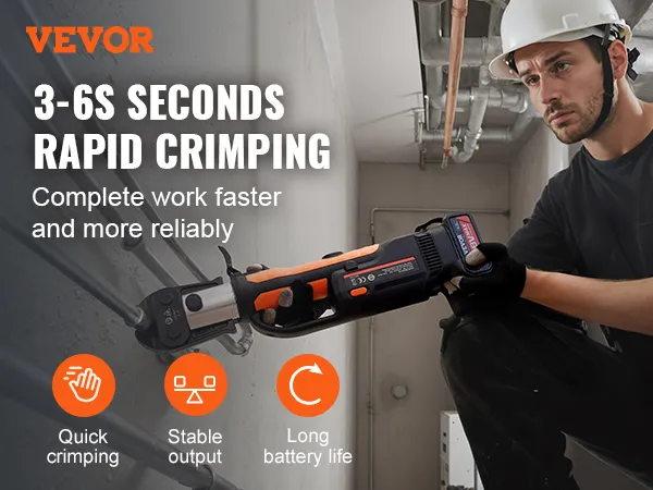 Convenient Operating Experience: This electric pipe crimping tool is compact in size, ideal for tight spaces and overhead tasks. Ergonomically designed handle for comfort; safety pin locks attachments in place to prevent unsafe conditions, providing greater operational flexibility and comfort for users.