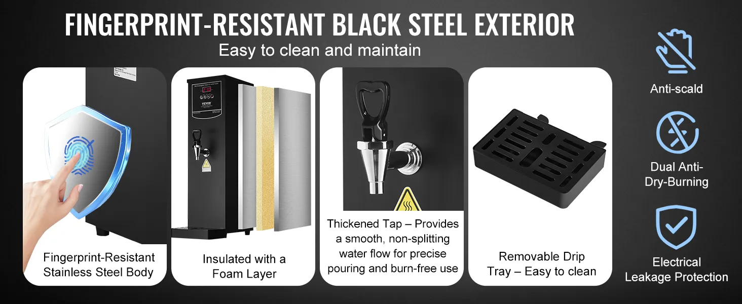 Efficiënte watertoevoer: de VEVOR 15L commerciële ketel is voorzien van een U-vormig verwarmingselement van 316 roestvrij staal dat de verwarmingscapaciteit verdubbelt. Met zijn krachtige 2500W verwarming levert hij tot 50 liter warm water per uur en zorgt hij voor een gelijkmatige waterstroom. Hij kan non-stop tot 200 kopjes water van 250 ml per uur afgeven, waardoor hij ideaal is voor drukke tijden. Het is bovendien vrij van zware metalen en garandeert daardoor veilig drinkwater.
