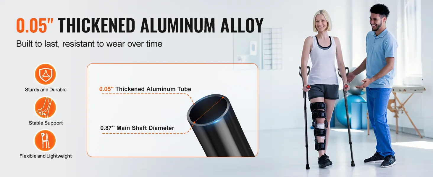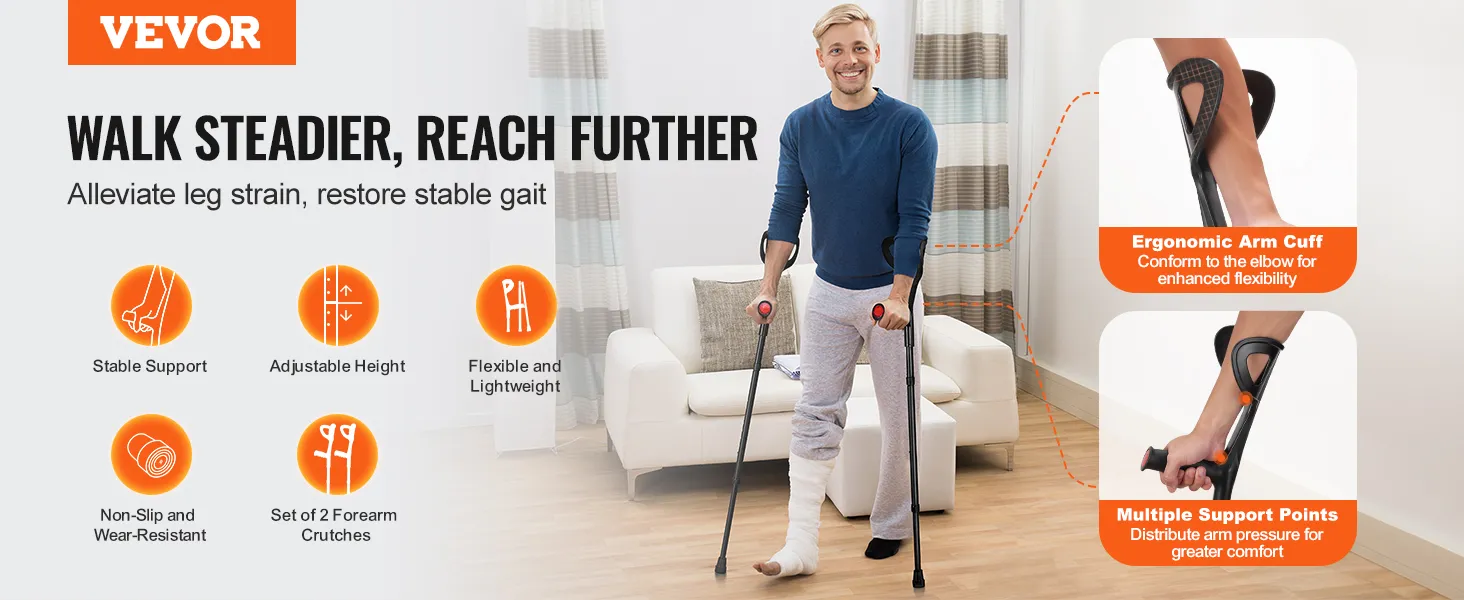 Reliable Walking Partner: VEVOR forearm crutches, crafted from durable aluminum alloy, support up to 350 lbs, ensuring stability and safety. Ideal for leg injuries, elderly, disabled, or post-surgical, alleviating your leg strain and restoring stable gait
