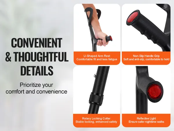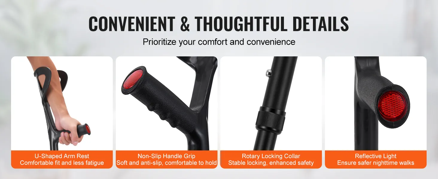 Relieve leg strain and walk with steadiness: Empower your mobility with VEVOR forearm crutches. Combining robust strength, unparalleled comfort, and 10-level adjustable height, they offer exceptional support and stability. Experience a safer and more confident walking journey with every step.