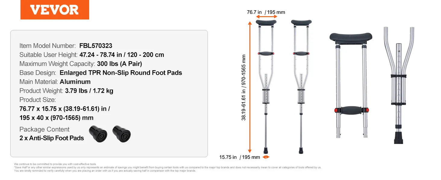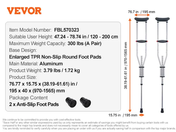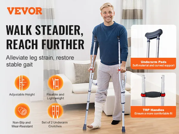 Relieve leg strain and walk with steadiness: Empower your mobility with VEVOR underarm crutches. Combining robust strength, unparalleled comfort, and 13-level adjustable height, they offer exceptional support and stability. Experience a safer and more confident walking journey with every step.