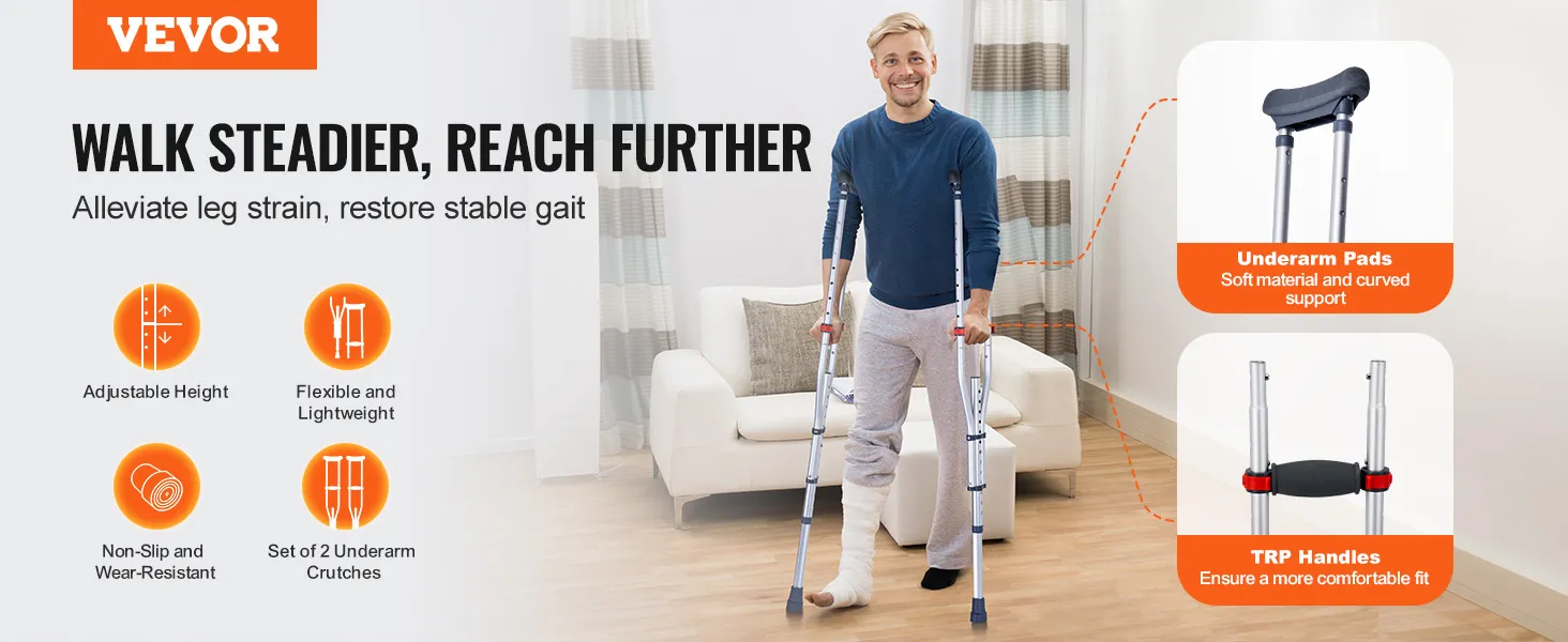 Reliable Walking Partner: VEVOR underarm crutches, crafted from durable aluminum alloy, support up to 300 lbs, ensuring stability and safety. Ideal for leg injuries, elderly, disabled, or post-surgical, alleviating your leg strain and restoring stable gait