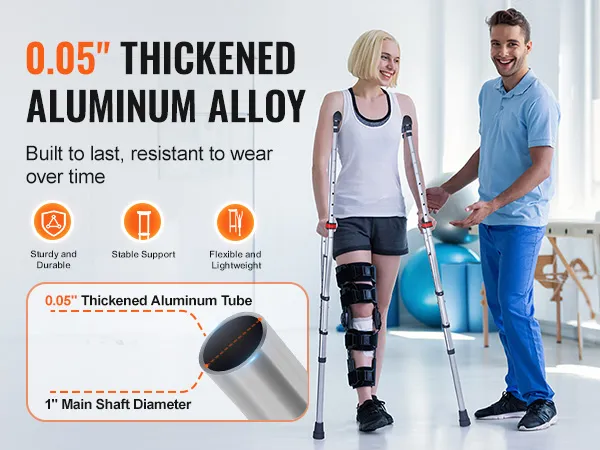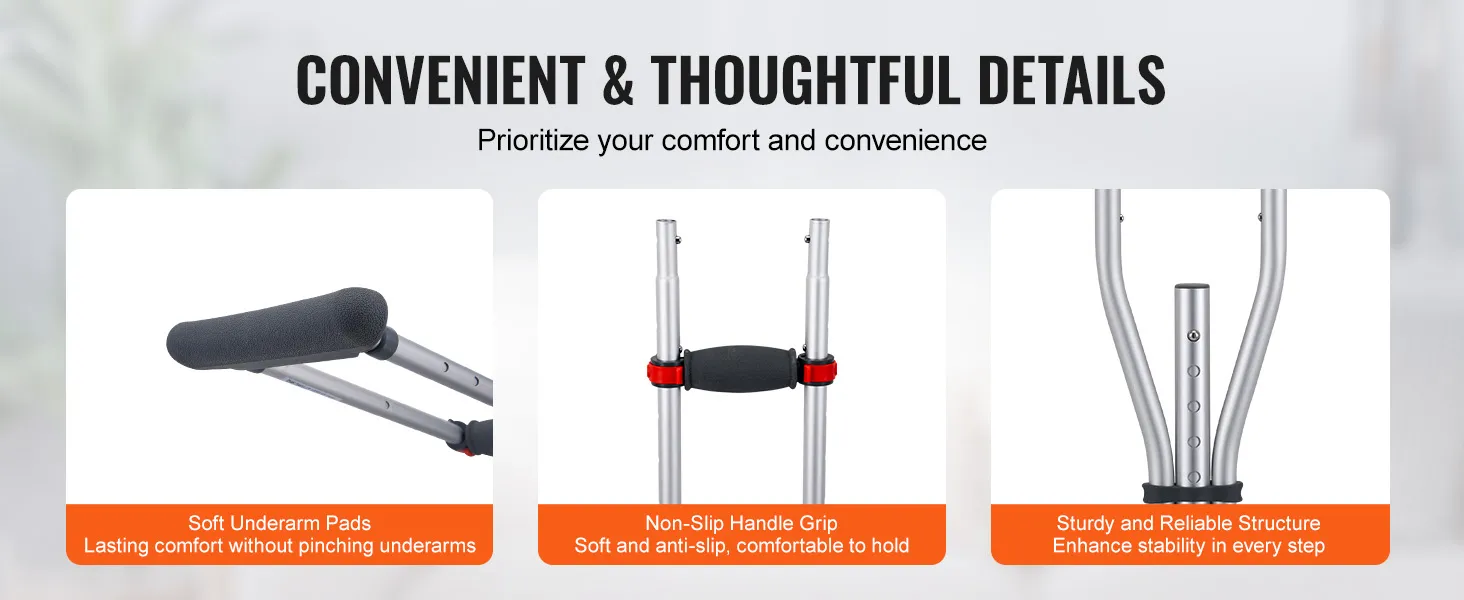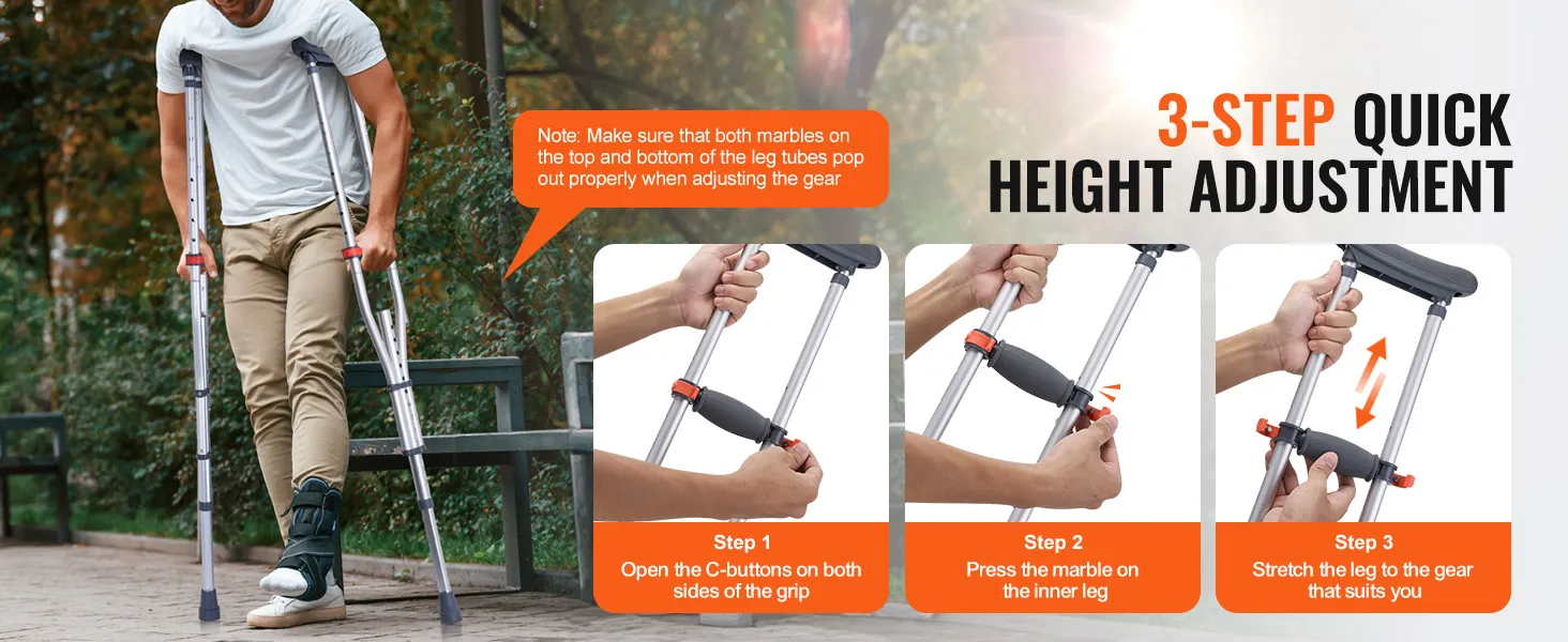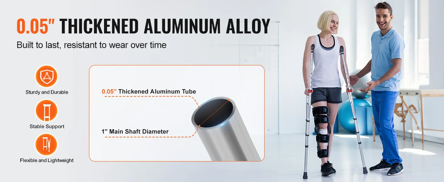 Our under arm crutches are made from strong yet lightweight aluminum alloy, capable of supporting up to 300 lbs, giving you the confidence to walk with ease. Lightweight and portable, it’s easy to carry and transport, perfect for travel and everyday use.