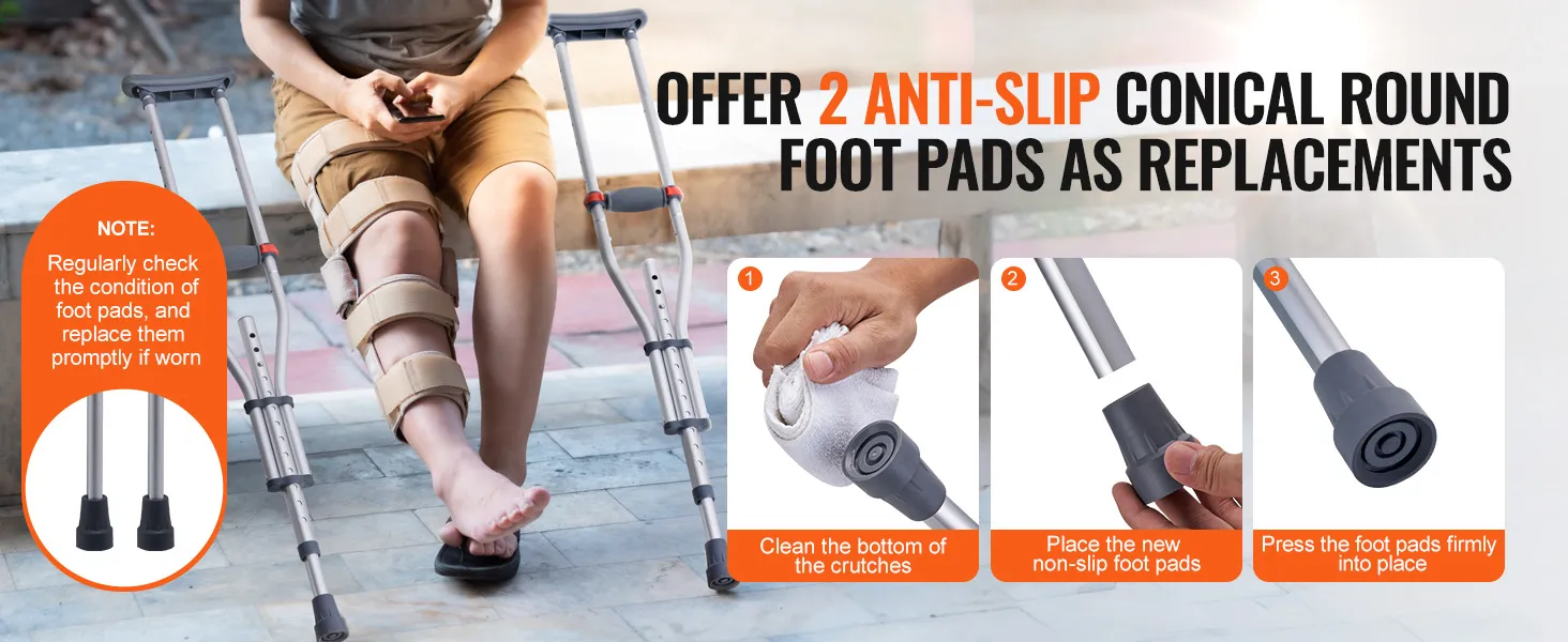 Our lightweight underarm crutches include enlarged, anti-slip TPR foot pads, ensuring great stability across various surfaces. The anti-slip texture provides secure traction on tiles, uneven ground, and concrete, offering a more stable walking experience.