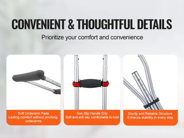 Comfort in Every Step: Our under arm crutches offer soft underarm pad, curved support and non-slip grip to relieve pressure on your underarm and handle, while relieving leg strain. Soft TPR handle ensures a snug fit for a more enjoyable walking experience
