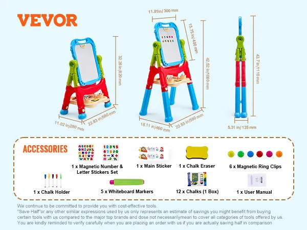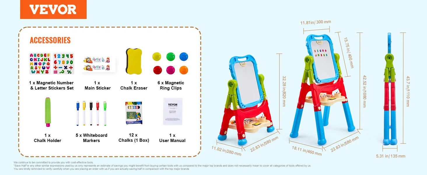 All-In-One Set: We've packed this kids easel with everything they need! It comes with 1 x magnetic number and letter stickers set, 1 x main sticker, 1 x chalk eraser, 6 x magnetic ring clips, 1 x chalk holder, 5 x whiteboard markers, and 12 x chalks—everything ready for them to dive into their next masterpiece.