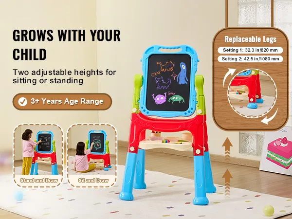 This art easel features two height settings, so you can set it to the perfect height for your child, whether they're sitting or standing. It's designed to grow with them, making every drawing session comfortable and fun.