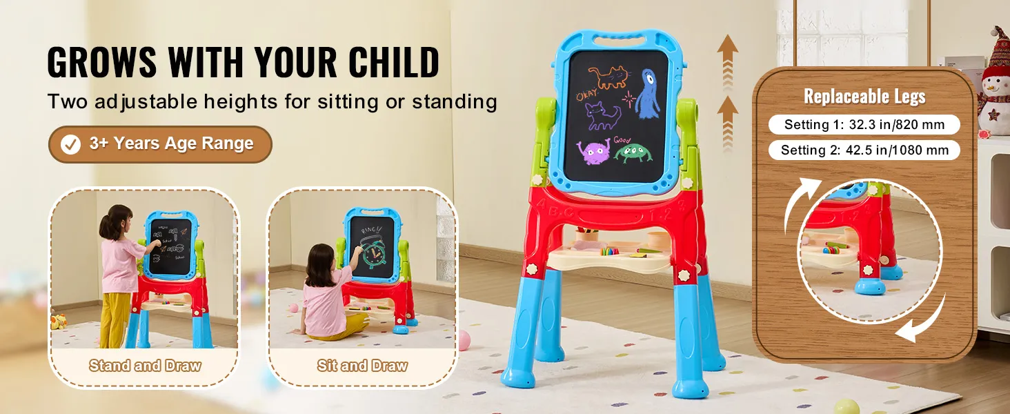 Adjustable Height: With two height settings (32.3 in/820 mm and 42.5 in/1080 mm), this kids art easel grows with your child, making it perfect for ages 3+. Just set it to the right height, and they're all set for a comfortable and enjoyable drawing experience.