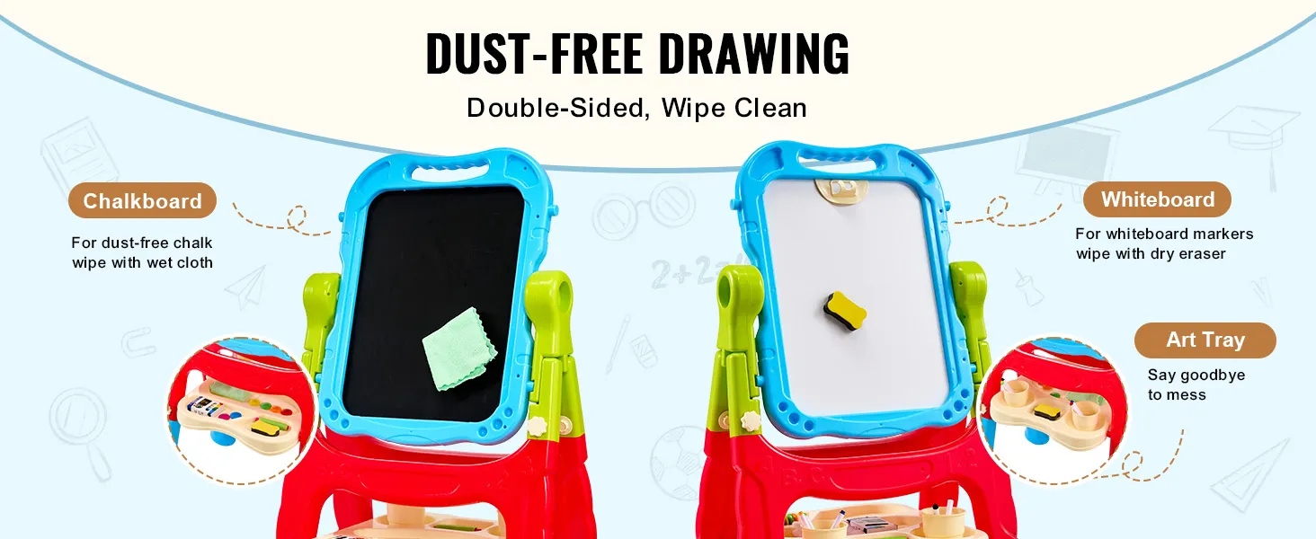 Both sides of the kids easel are dust-free, so no more worrying about harmful particles. After the fun, just wipe it down with a damp cloth and dry erase, and it's good as new. The art tray keeps everything tidy so parents can rest easy.