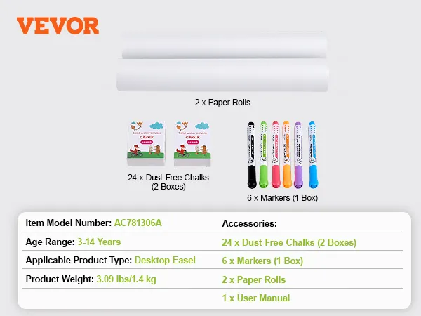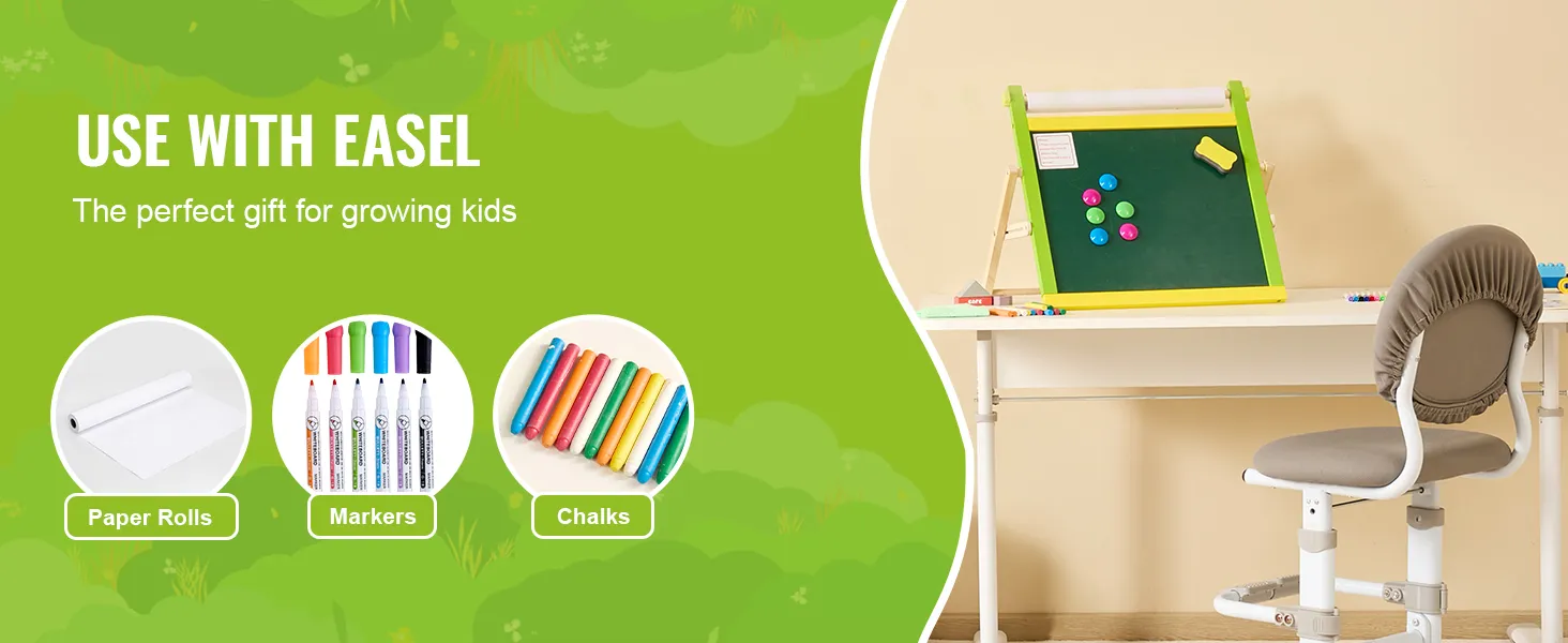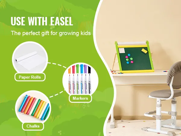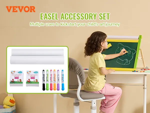 This easel accessory set includes 24 dust-free chalks, 6 markers, and 2 paper rolls—perfect for kids aged 3 to 10. It's a great way to inspire your child to dive into the world of colors and enjoy the fun of creating art.