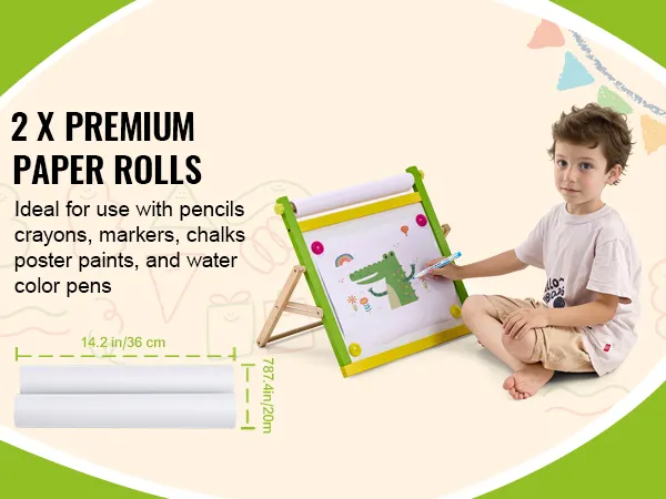 This painting kit includes 2 paper rolls that are just right for your kids art easel. They work well with pencils, crayons, markers, chalk, poster paints, or water color pens—perfect for all their creative needs.