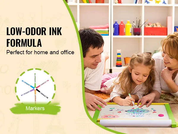 Low-Odor Markers: These low-odor markers come in 6 vibrant colors, perfect for home, school, or even the office. They wipe clean easily with a dry cloth or eraser, leaving no remains behind—just a clean surface ready for the next masterpiece.