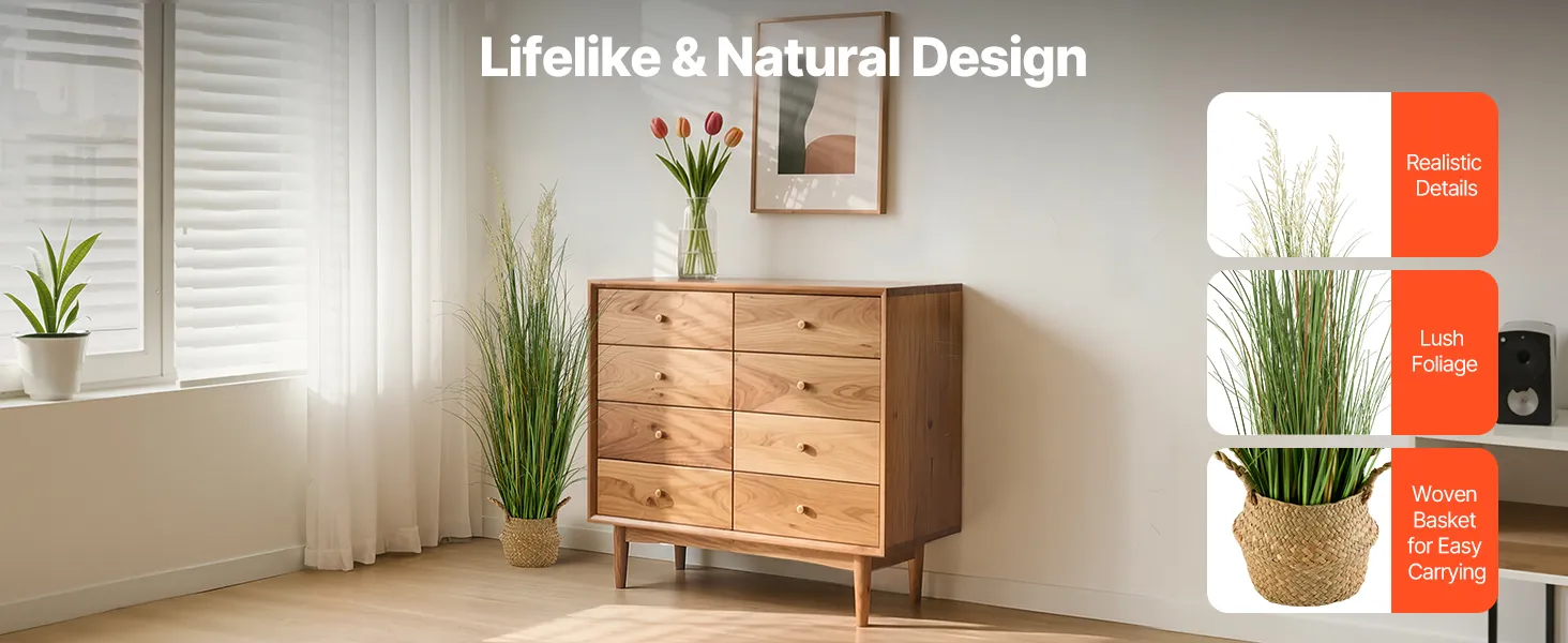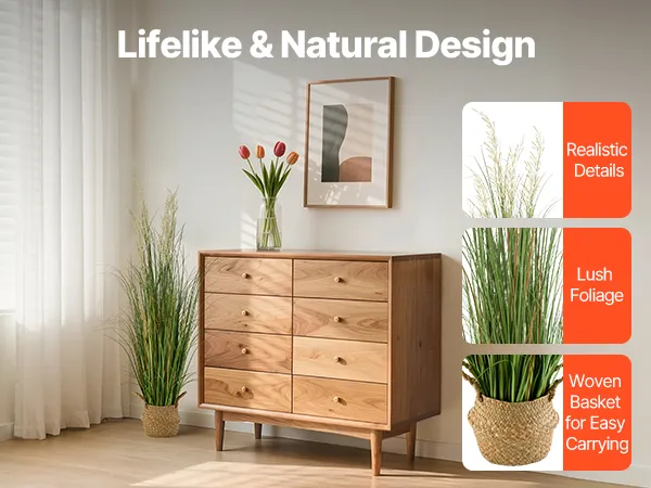 Direct klaar voor gebruik: Deze realistische grasplant wordt geleverd met een lichtgewicht kunststof pot en een veelzijdige gevlochten mand. Montage is niet nodig; hij is direct uit de doos klaar voor gebruik. Ideaal om groen en charme toe te voegen aan huizen, tuinen, terrassen, hotels, restaurants of kantoren.