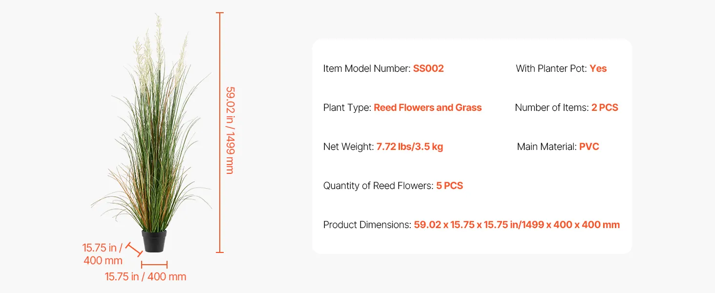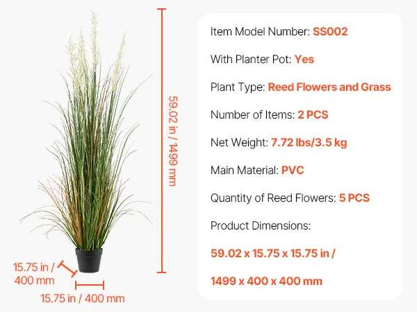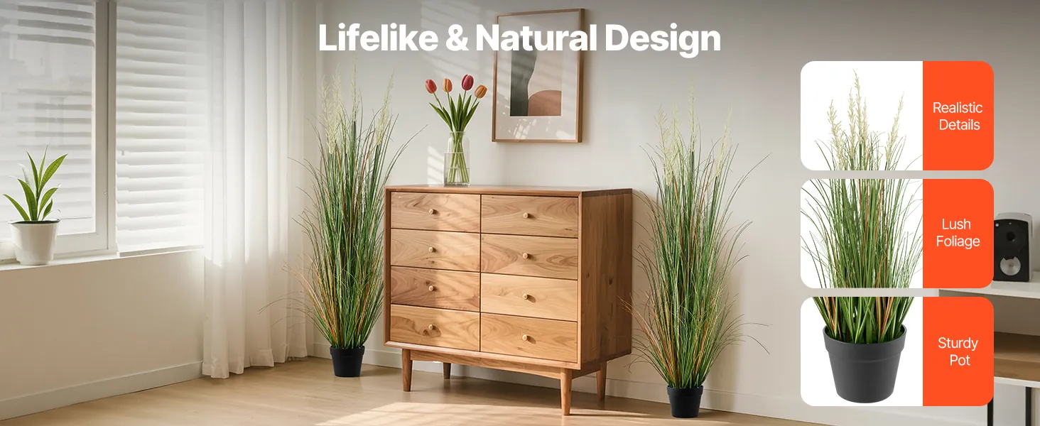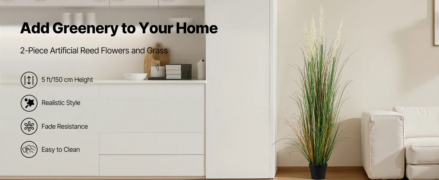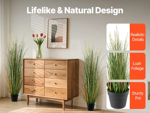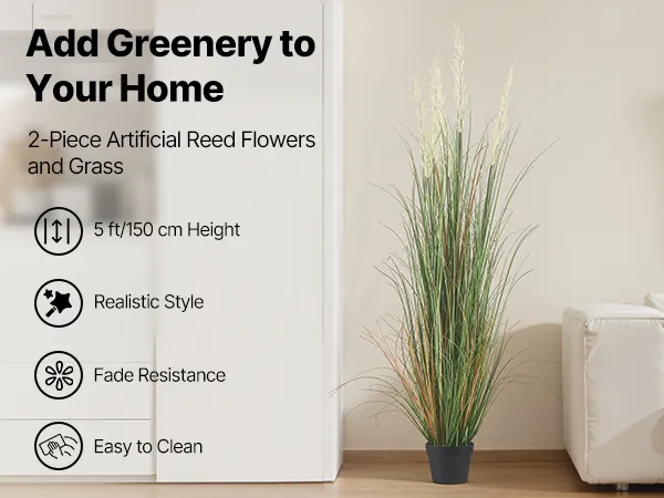 Frisse, natuurlijke decoratie: deze tweedelige kunstgrasset is 1499 mm hoog en heeft vijf rietstengels en gras aan elke stengel. Het voegt een natuurlijke, elegante touch toe aan je leefruimte en creëert een natuurlijke omgeving.